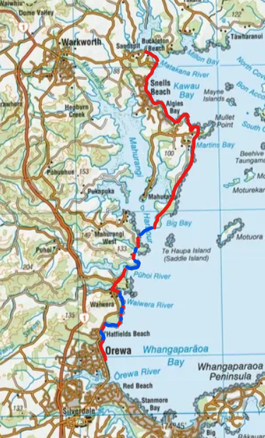 From there it was across the stream and up and over the hill, and down toward the Sullivans Bay campground on the Mahurangi Harbour.